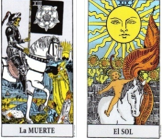 El color blanco está relacionado con la luz, la claridad, el día, el bien, la perfección. Es el color de los dioses, representa la verdad, la inocencia y la pureza. En el caso de la Muerte representa el camino hacia la Luz, los cambios y transformaciones que debemos hacer para llegar a la verdad, a la perfección. En el Sol, representa la inocencia, la pureza que viene de la mano del niño interior.