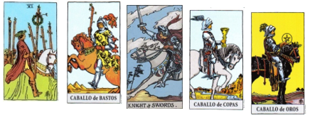 Podemos ver el 6 de bastos y los caballos de los caballeros de los 4 palos.