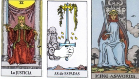 El Rey de espadas por ser una figura masculina de un elemento activo, se entiende muy bien con esta energía. Mirando al presente igual que la Justicia, el aquí y ahora, analizando, pensando, midiendo sus actos, con su coherencia, rectitud, imparcialidad y ejemplaridad que le destacan.