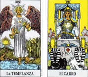 El Carro además de representar al signo de Cáncer, también tiene parte de esa energía sagitariana que le lleva a avanzar con confianza para poder explorar nuevos territorios que le aporten nuevas enseñanzas y experiencias. La Templanza conecta con esa parte de Sagitario que le permite adaptarse y fluir en los distintos escenarios y situaciones de la vida. Su buen carácter y la necesidad de dar un sentido elevado a su vida.
