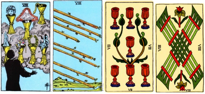 - Dirección. En el 8 de bastos observamos que los bastos llevan una dirección. Se mueven ordenadamente hacia un punto en concreto. Apuntando hacia el suelo para poder concretarse. En cambio, en el 7 de copas todo está flotando, no hay una dirección concreta, hay diferentes posibilidades.