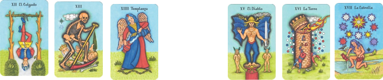 - La Muerte está rodeada y acompañada de cartas espirituales. Viene del Colgado que sus pies apuntan hacia lo celestial y se dirige hacia el ángel que le conecta con su alma.