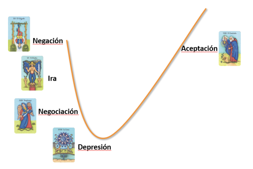 A continuación, voy a explicar estas 5 fases del duelo, que relacionaré con 5 arcanos mayores. Esto nos va a permitir poder ver a nuestro consultante en qué fase está y así poderle ayudar.