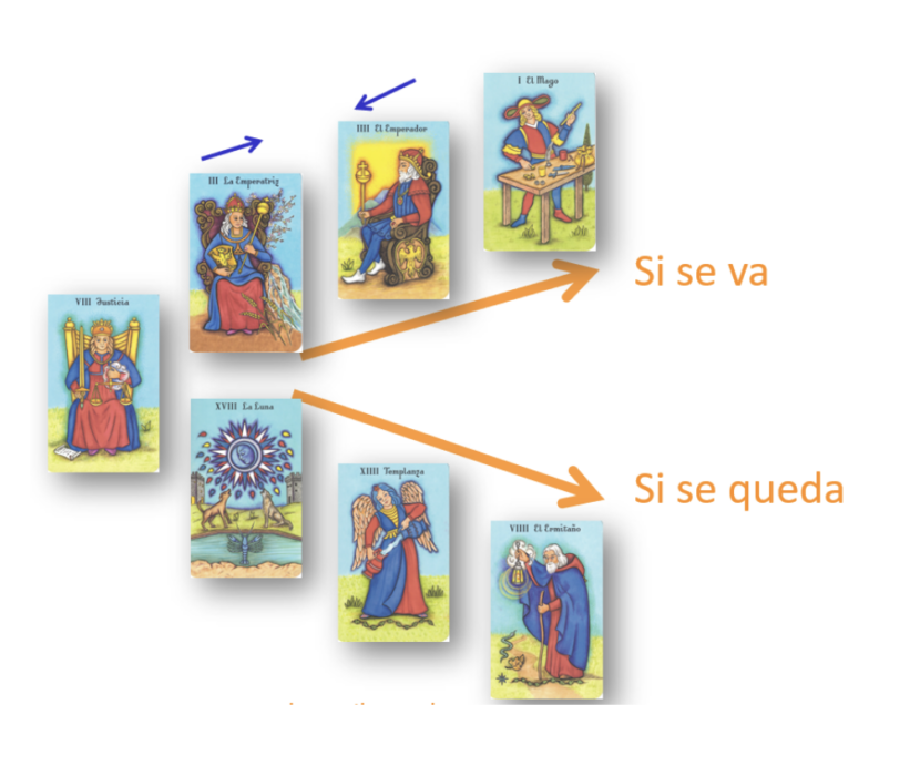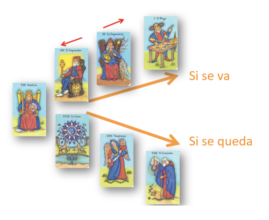 - Hilera descendente (Quedarse a trabajar en Barcelona): la Luna nos indica las dudas que tiene o la insatisfacción que puede provocarle si se queda en Barcelona y declina la opción de ir a Berlín. La Templanza que le sigue, nos indica que tendrá la capacidad de adaptare y seguir fluyendo en su situación actual. El Ermitaño al final, nos indica que se le puede hacer aburrido y un poco rutinario el trabajo, pero le da una estabilidad y seguridad a largo plazo.