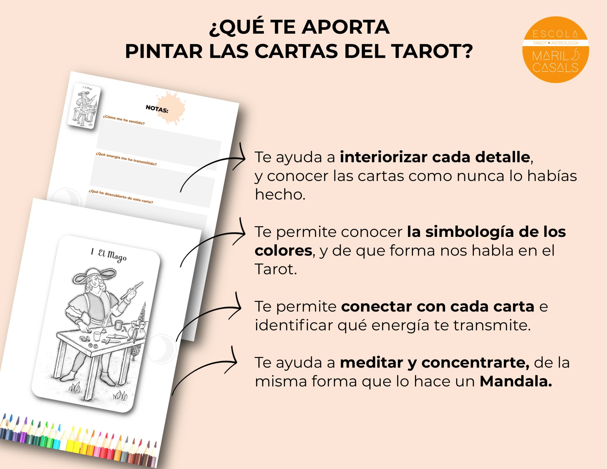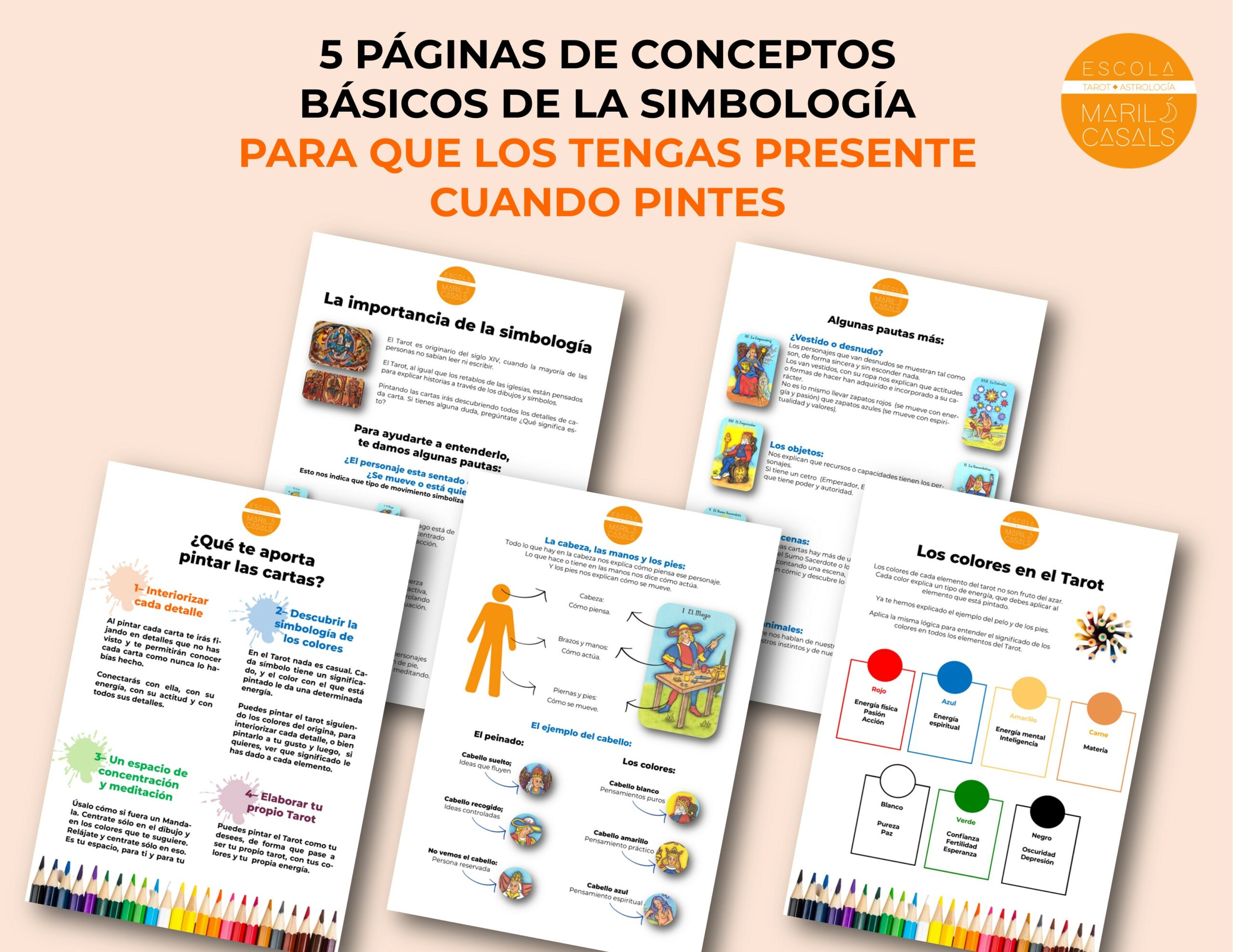 • 5 páginas de información básica sobre la simbología del Tarot, que ayudará a comprender el significado de cada detalle de las cartas mientras se colorean.