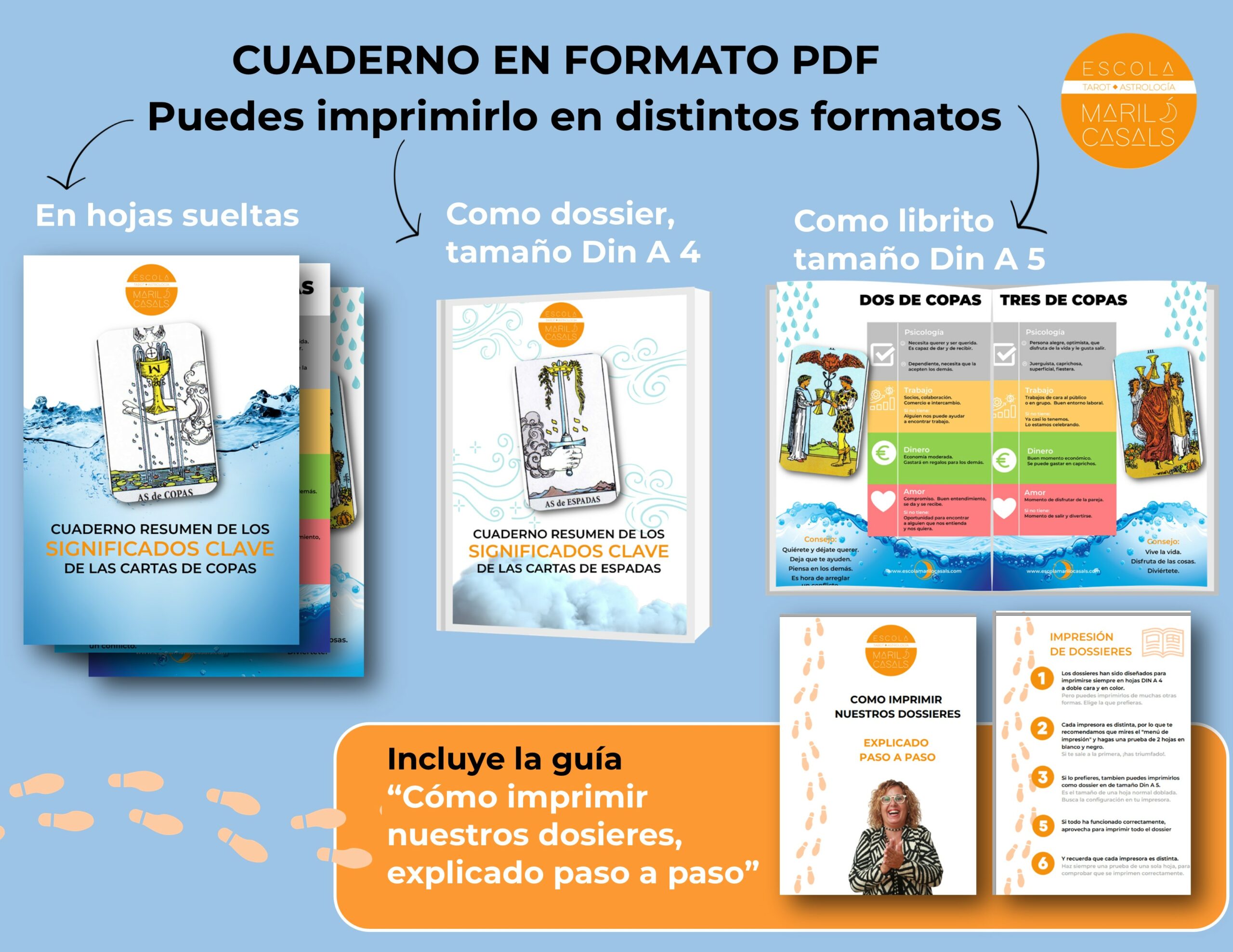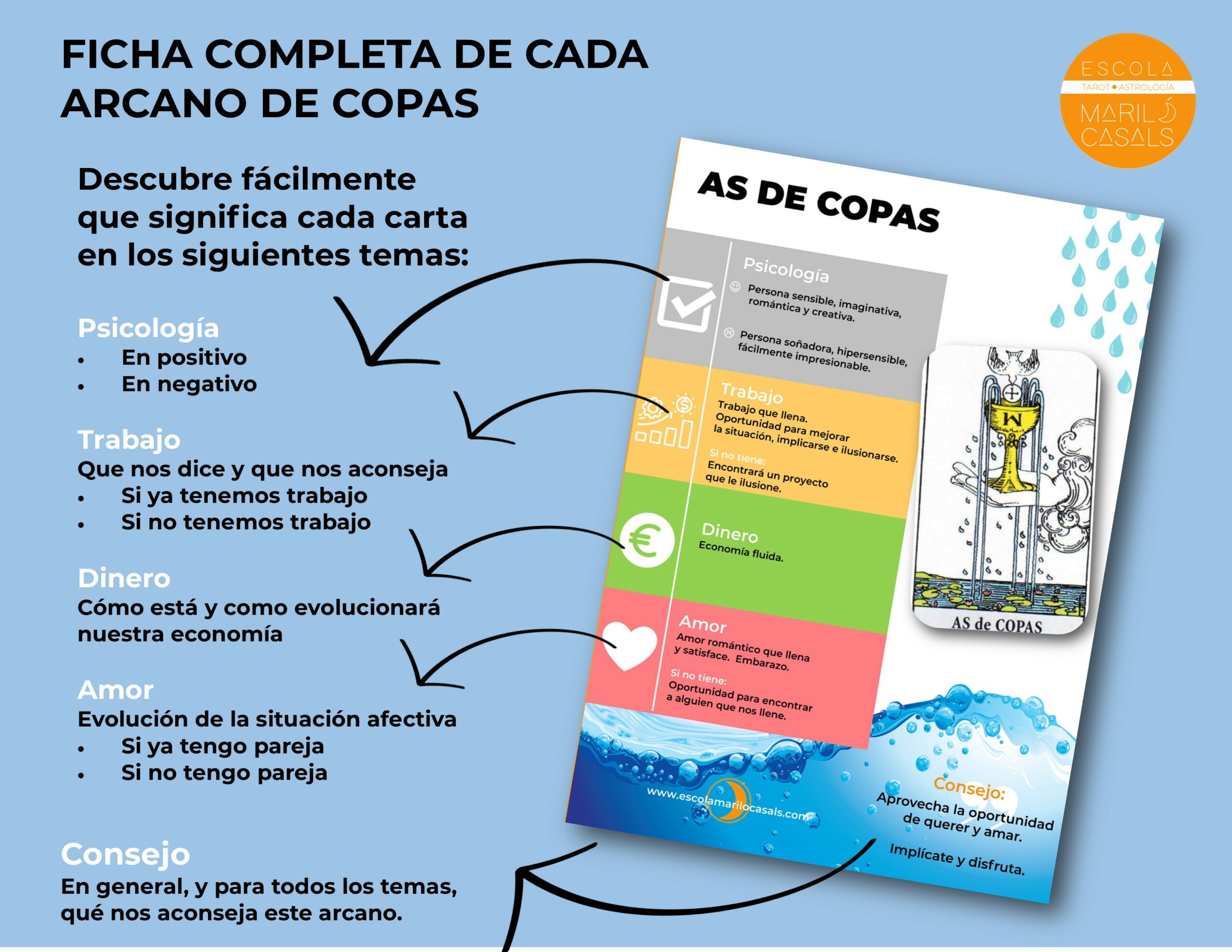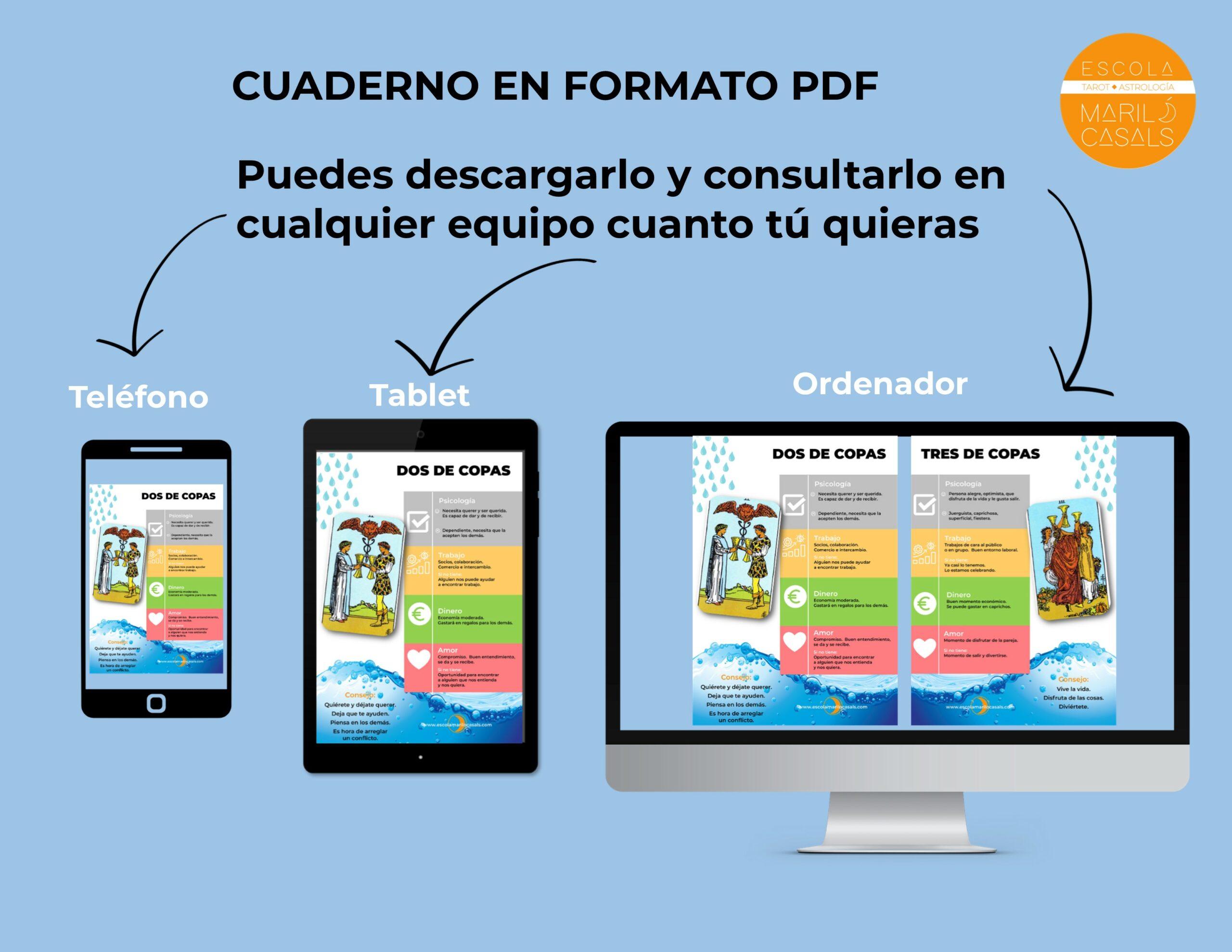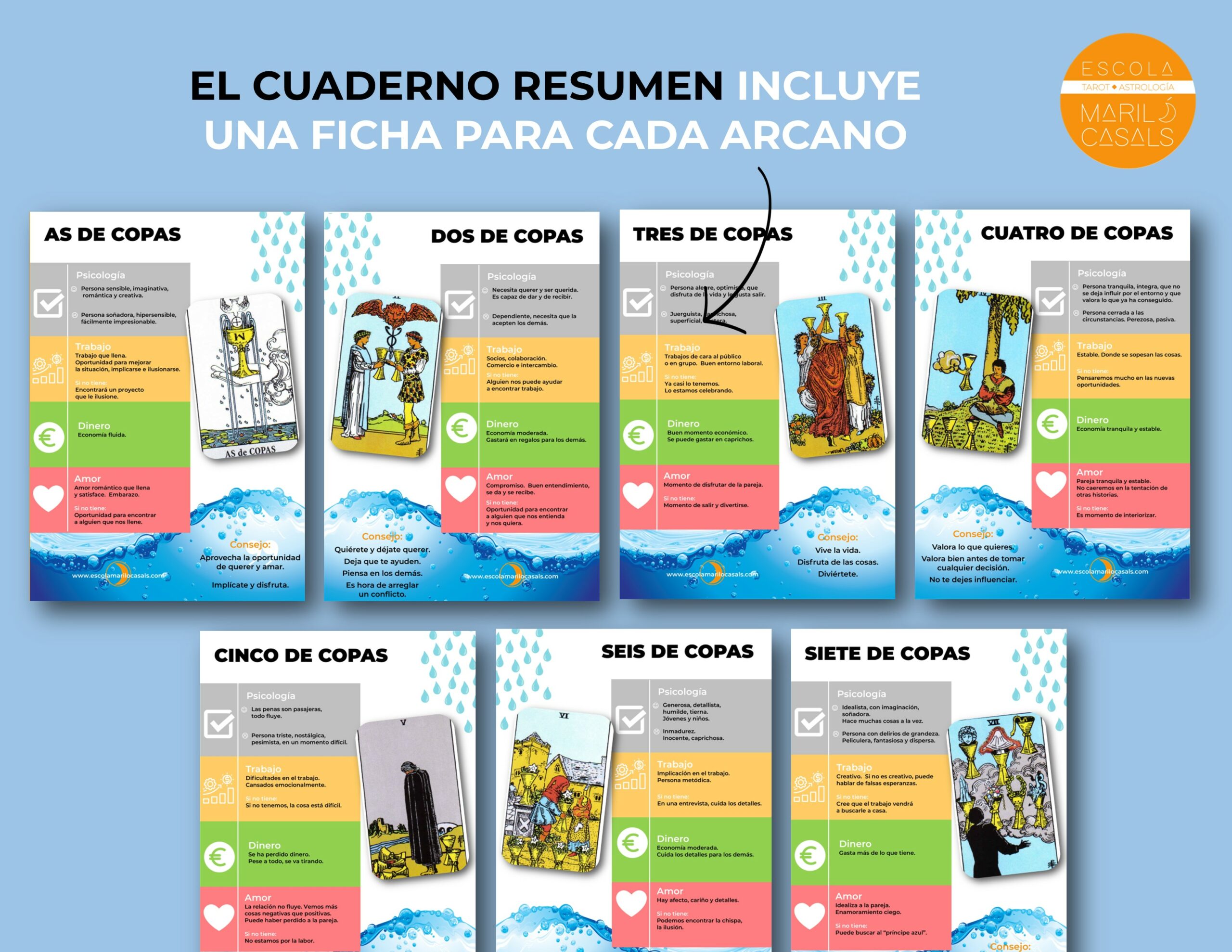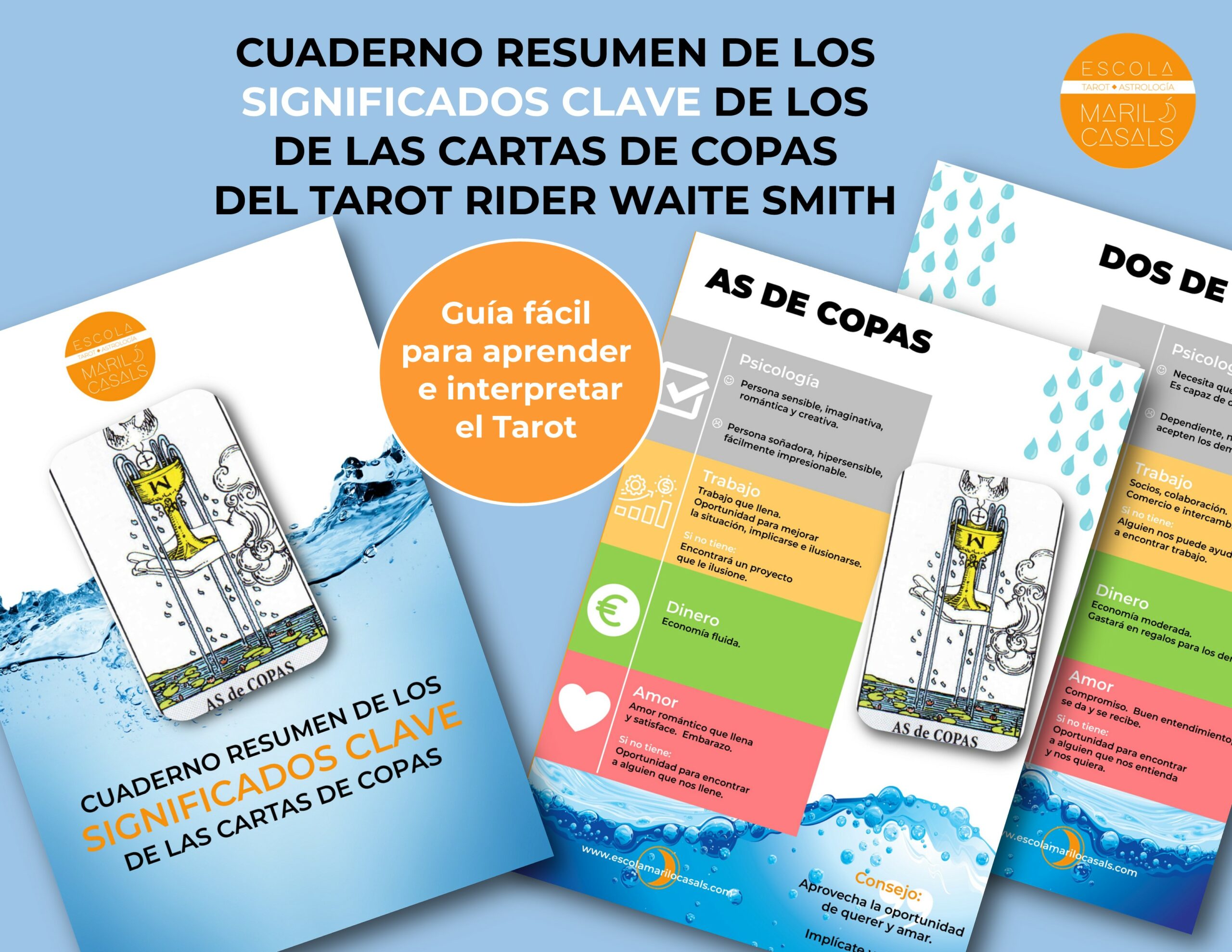 - Un archivo PDF el Cuaderno de los significados clave de los 14 arcanos del palo de Copas del Tarot, ilustrado con el Tarot Rider Waite Smith
