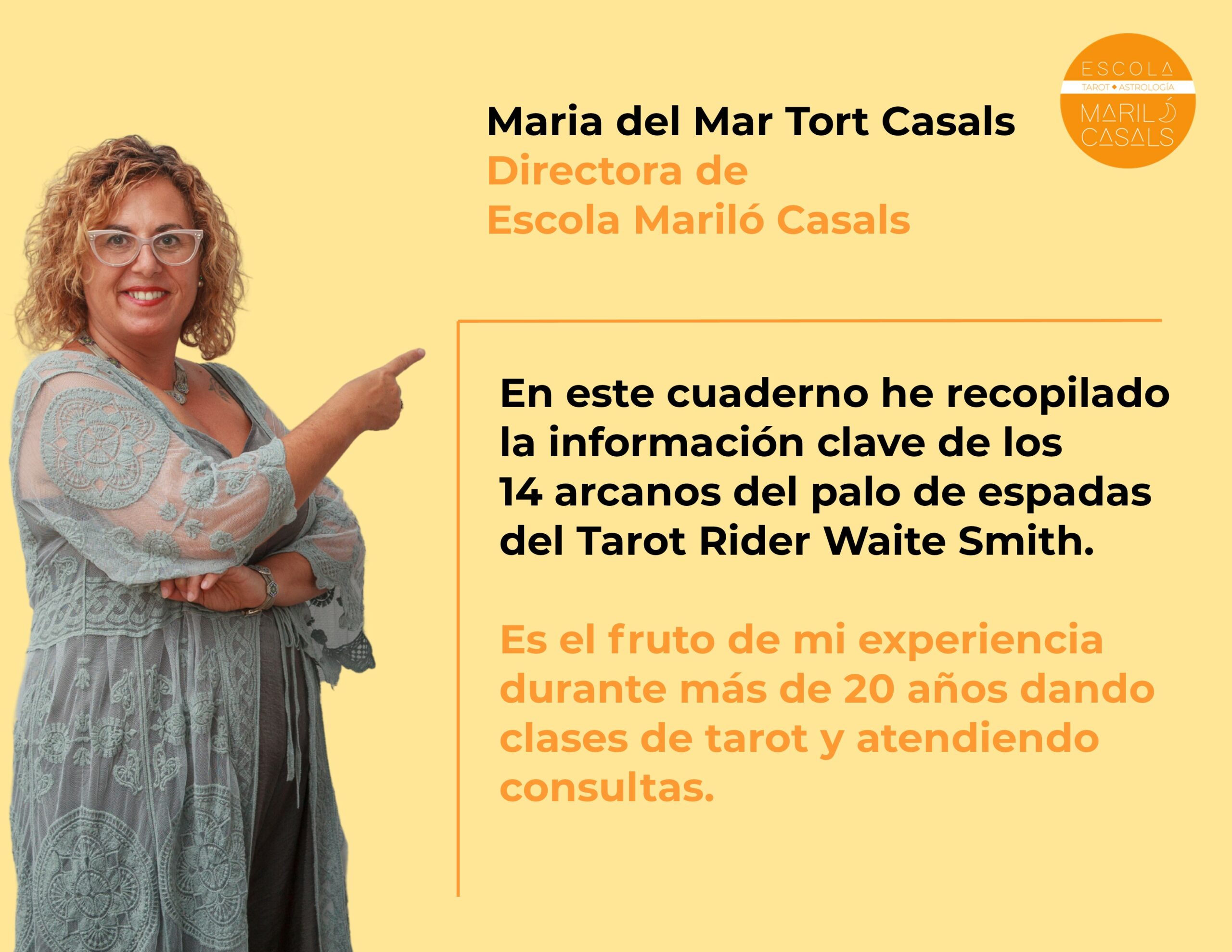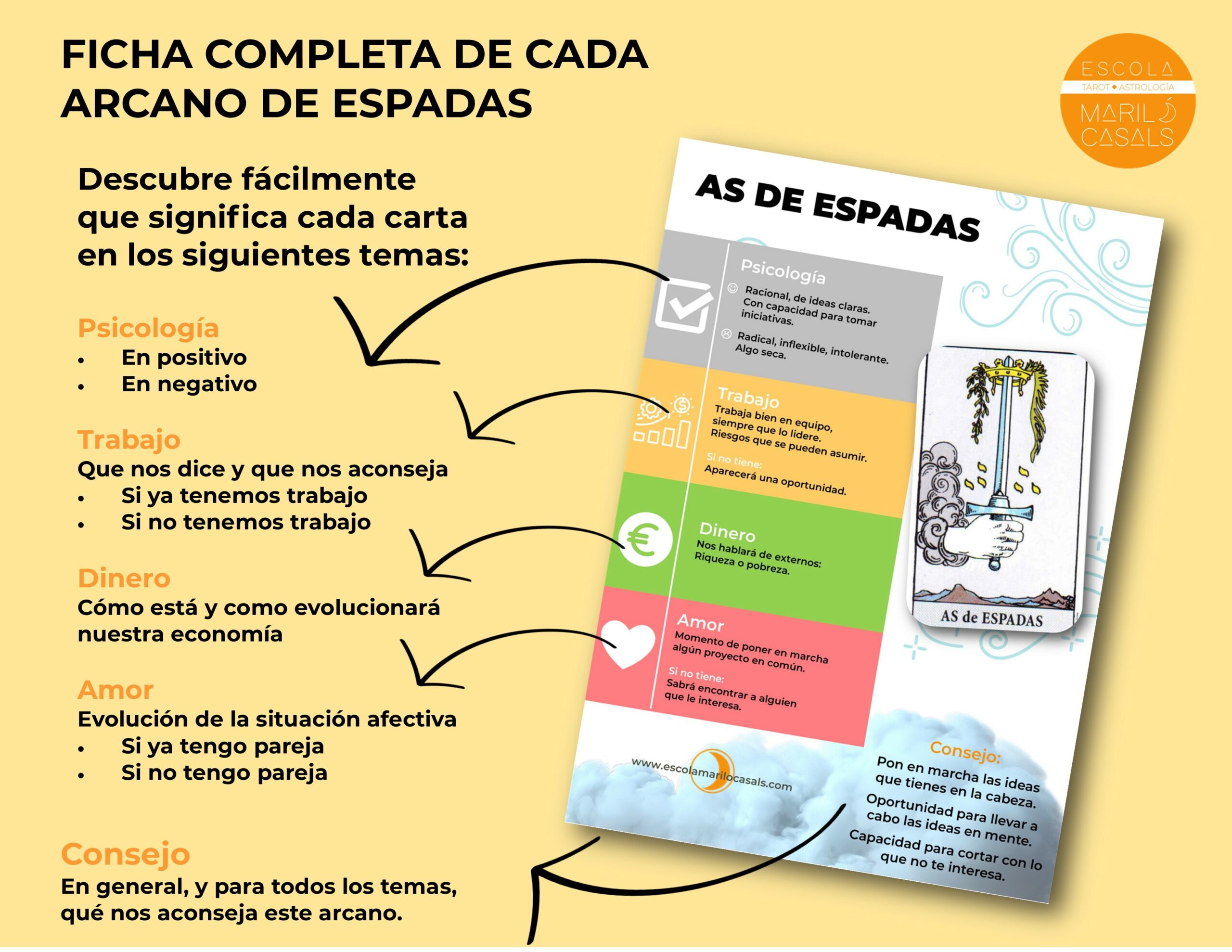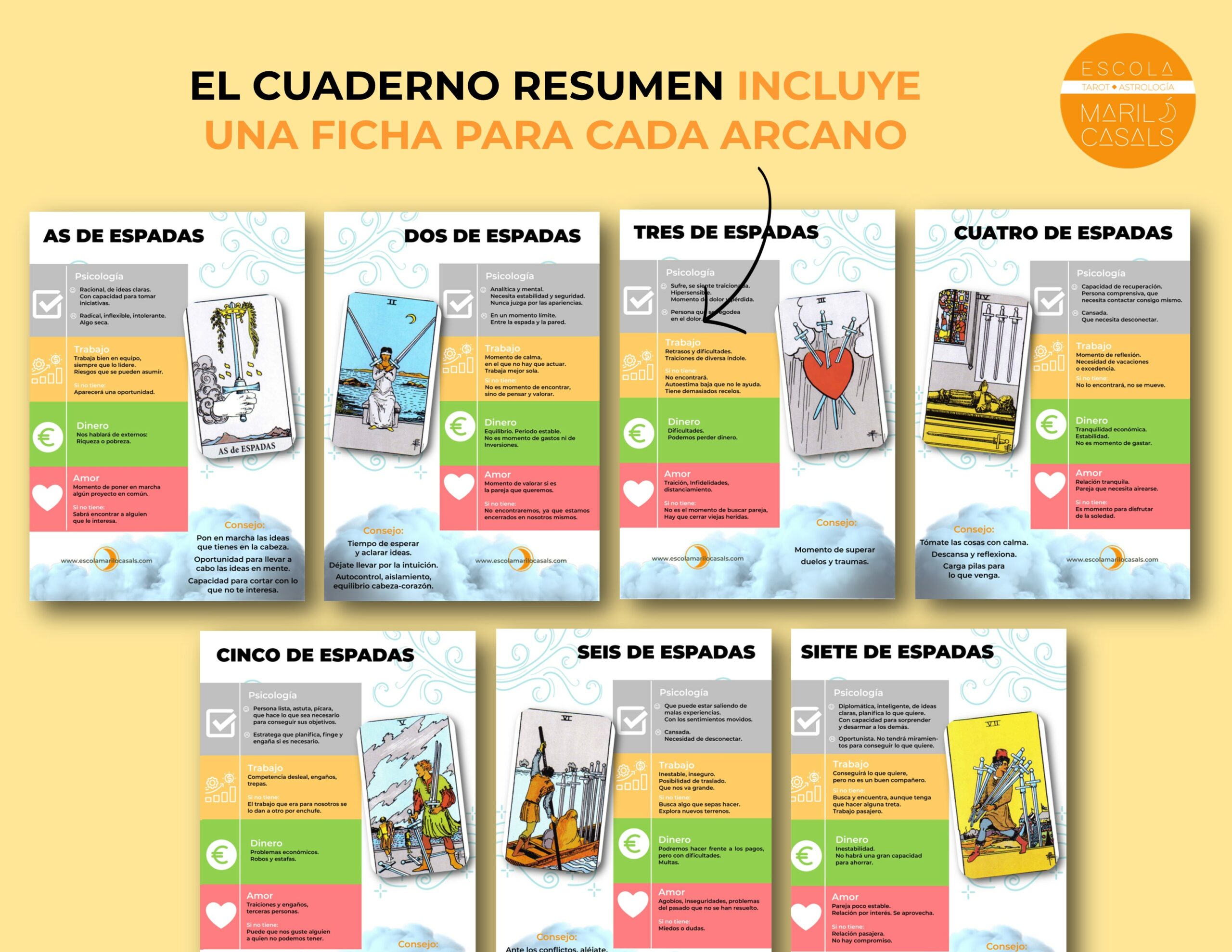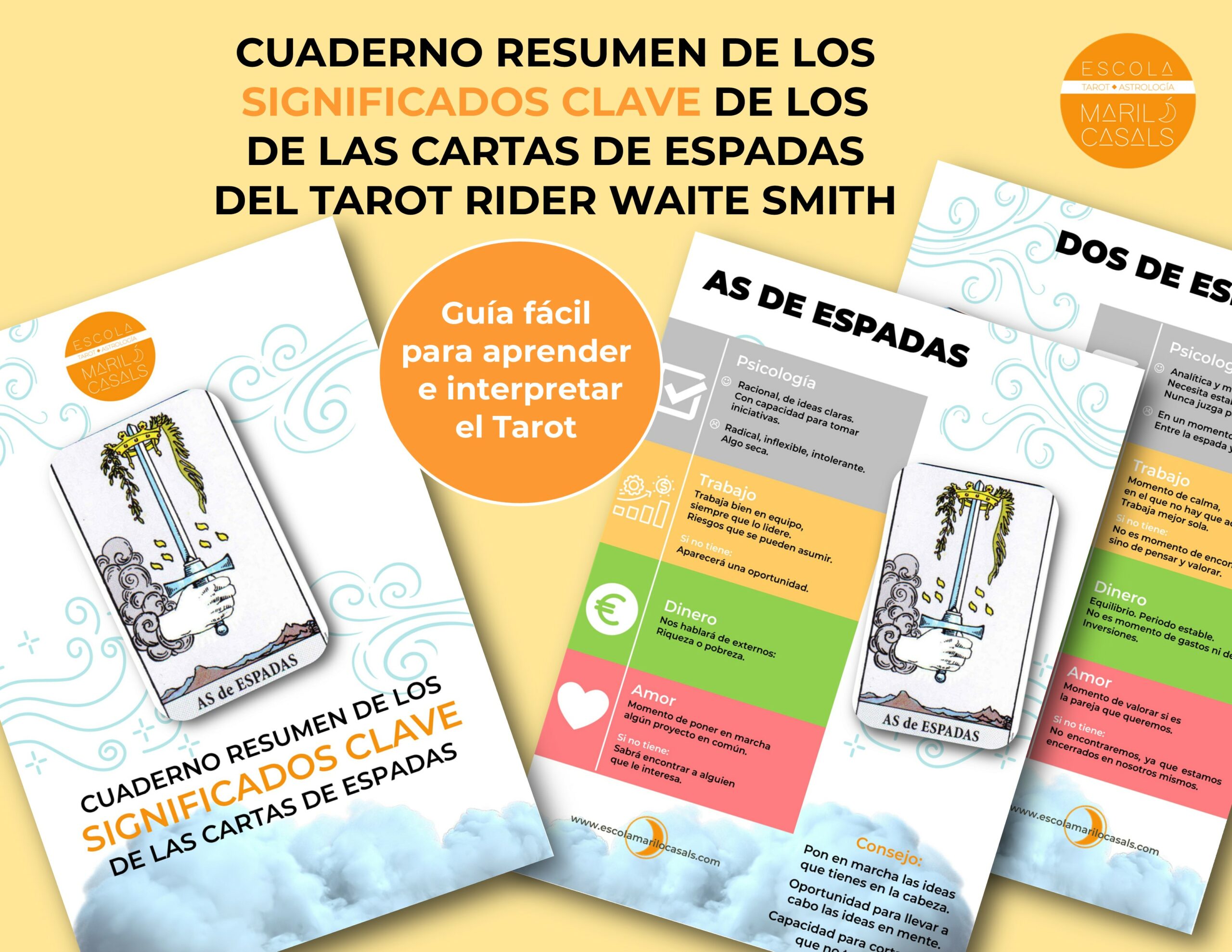 - Un archivo PDF el Cuaderno de los significados clave de los 14 arcanos del palo de Espadas del Tarot, ilustrado con el Tarot Rider Waite Smith