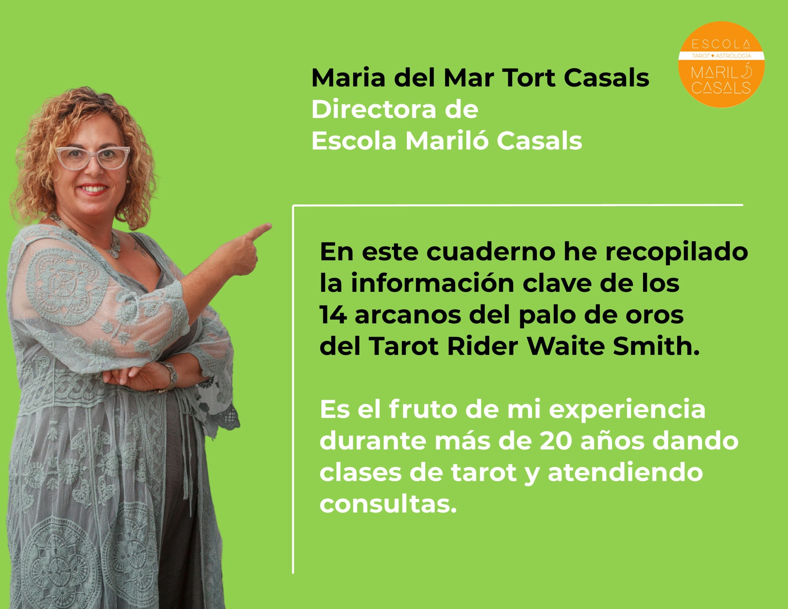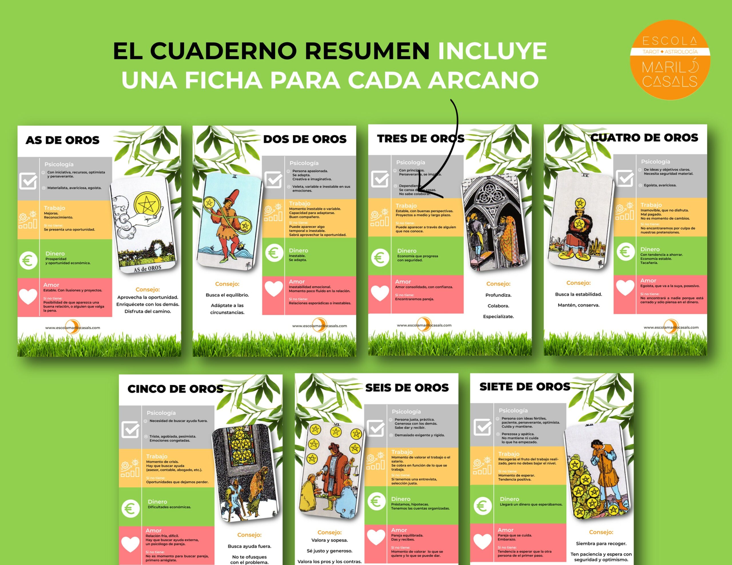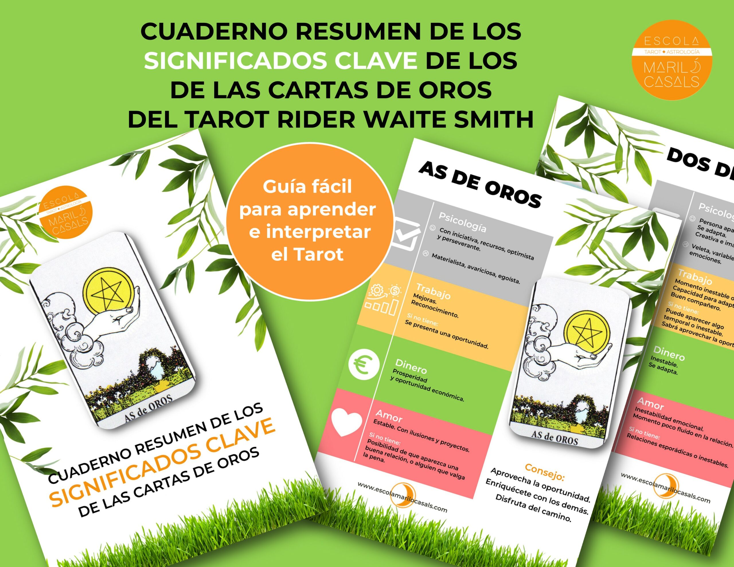- Un archivo PDF el Cuaderno de los significados clave de los 14 arcanos del palo de Oros del Tarot, ilustrado con el Tarot Rider Waite Smith