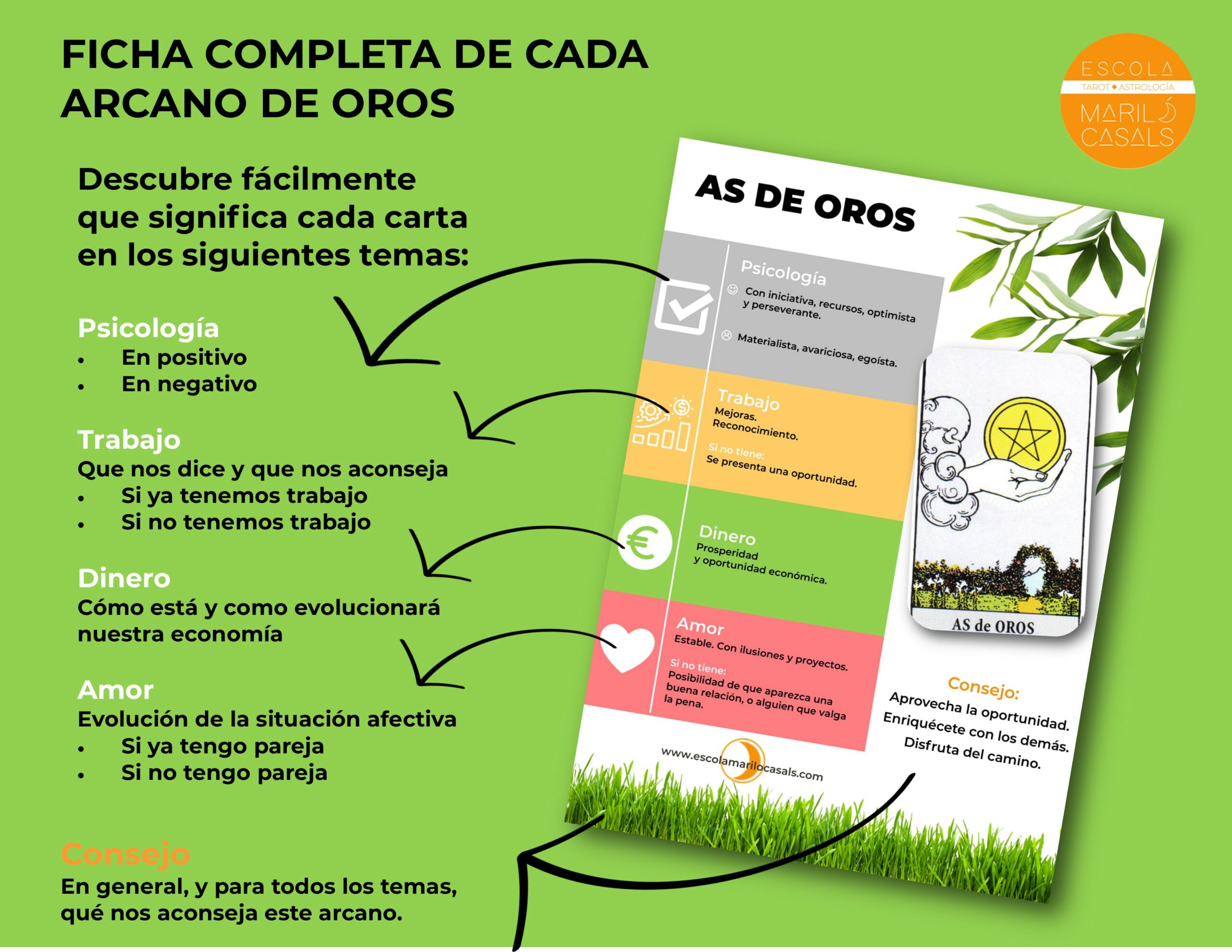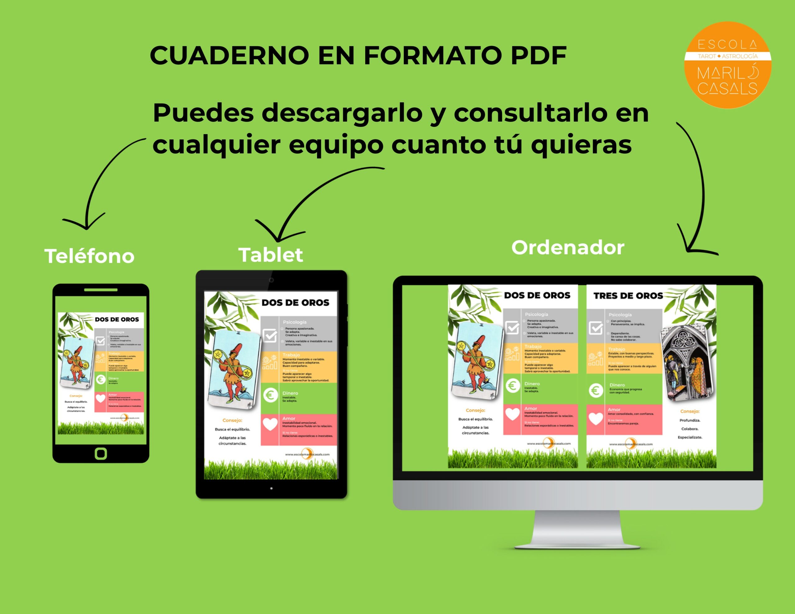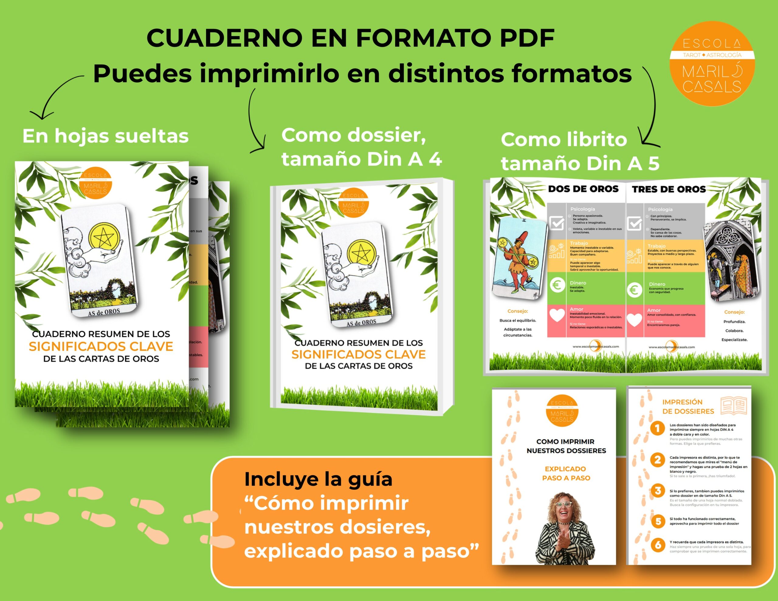 - Un archivo PDF el Cuaderno de los significados clave de los 14 arcanos del palo de Oros del Tarot, ilustrado con el Tarot Rider Waite Smith