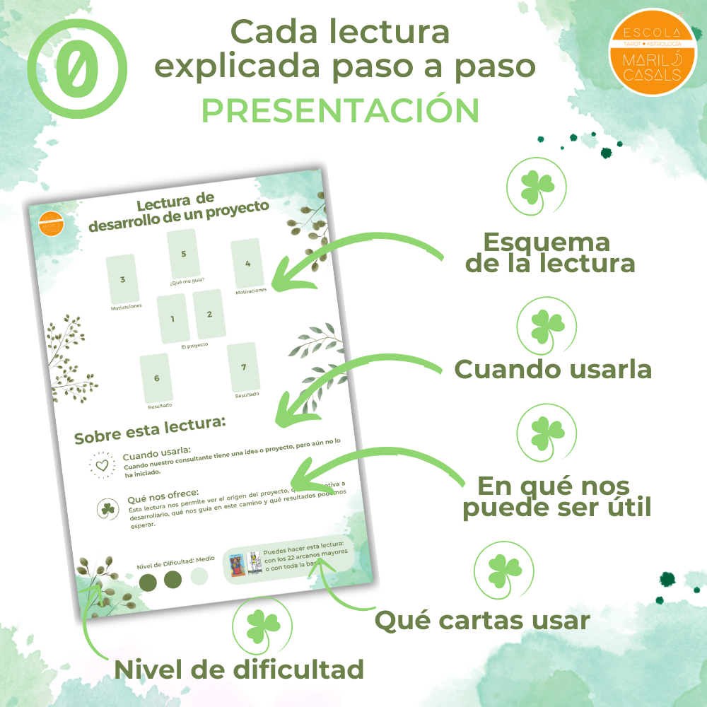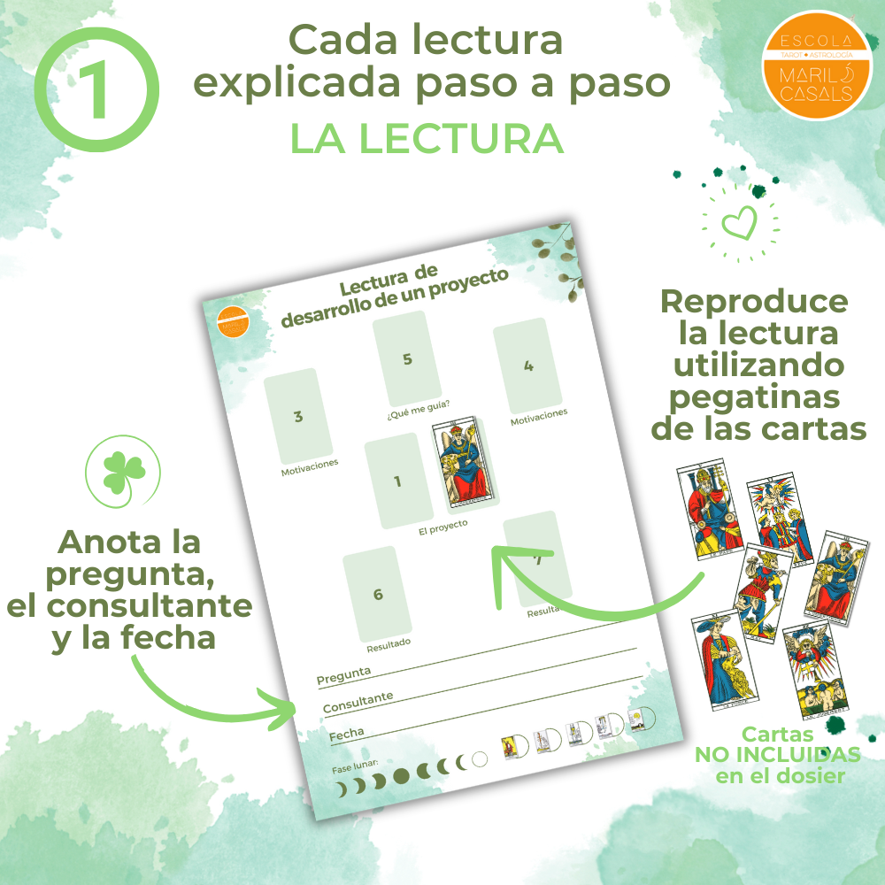 • Páginas para realizar la interpretación paso a paso: Espacio para rellenar la interpretación de cada una de las cartas, con orientaciones y recomendaciones personalizadas para cada carta de cada lectura.